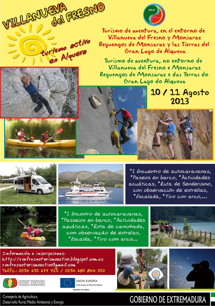Olá, a Direção Geral de Desenvolvimento Rural do Governo da Extremadura, como socio do projecto ADLA do Programa Operativo de Cooperação Transfronteiriça Espanha-Portugal 2007-2013, cofinanciado com fundos FEDER, impulsou a organização de um programa de actividades denominada “Turismo de aventura no entorno de Villanueva del Fresno e Monsaraz – Reguengos de Monsaraz e das terras do Grande Lago do Alqueva”.